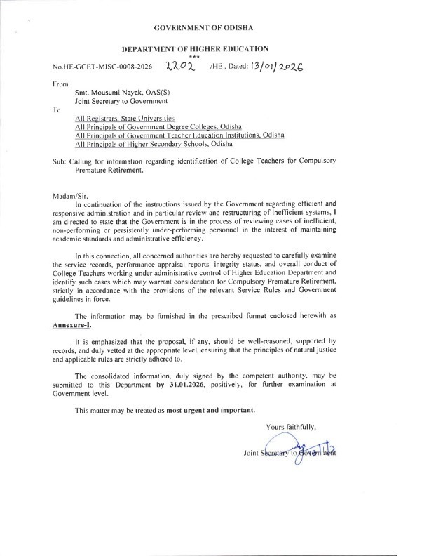 ​​​ସୂଚନାନୁଯାୟୀ, ଉଚ୍ଚ ଶିକ୍ଷା ବିଭାଗ ନନ୍ ପରଫର୍ମିଂ କଲେଜ ଅଧ୍ୟାପକଙ୍କ ତାଲିକା ମାଗିଛି। ରାଜ୍ୟର ସବୁ ବିଶ୍ଵ ବିଦ୍ୟାଳୟର ରେଜିଷ୍ଟ୍ରାର, ସରକାରୀ ଡିଗ୍ରୀ କଲେଜର ପ୍ରିନ୍ସିପାଲ, ସରକାରୀ ଶିକ୍ଷଣ ତାଲିମ ଶିକ୍ଷାନୁଷ୍ଠାନର ପ୍ରିନ୍ସିପାଲ ଓ ସମସ୍ତ ଉଚ୍ଚ ମାଧ୍ୟମିକ ସ୍କୁଲର ପ୍ରିନ୍ସିପାଲ ମାନଙ୍କୁ ଚିଠି ଲେଖିଛି। କାର୍ଯ୍ୟଦକ୍ଷତା ଓ ଆଚରଣ ଯାଞ୍ଚ ପାଇଁ ଉଚ୍ଚଶିକ୍ଷା ବିଭାଗର କଡ଼ା ନିର୍ଦ୍ଦେଶନାମା ଜାରି ହୋଇଛି । ଜାନୁଆରୀ ୩୧ ସୁଦ୍ଧା ରିପୋର୍ଟ ଦାଖଲ ପାଇଁ କଲେଜ କର୍ତ୍ତୃପକ୍ଷଙ୍କୁ ଚିଠି ହୋଇଛି।
