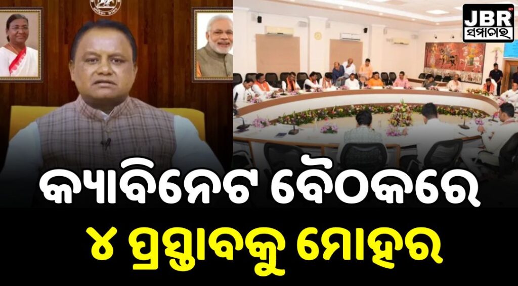ଭୁବନେଶ୍ୱର: ମୁଖ୍ୟମନ୍ତ୍ରୀ ମୋହନ ଚରଣ ମାଝୀଙ୍କ ଅଧ୍ୟକ୍ଷତାରେ ଲୋକସେବା ଭବନରେ ଆଜି ହୋଇଥିବା ରାଜ୍ୟ କ୍ୟାବିନେଟ ବୈଠକରେ ୪ଟି ପ୍ରସ୍ତାବକୁ ଅନୁମୋଦନ ମିଳିଛି । ବୈଠକରେ ମୁଖ୍ୟ ଶାସନ ସଚିବ ସହିତ ବିଭିନ୍ନ ବିଭାଗର ସଚିବ ଓ ବିଭାଗୀୟ ମନ୍ତ୍ରୀମାନେ ଉପସ୍ଥିତ ଥିଲେ ।